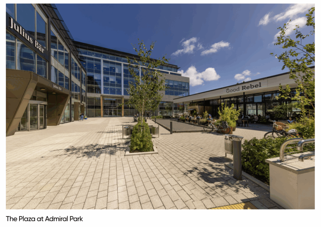 The Plaza at Admiral Park encompasses four major developments by Rihoy and Son: The Julius Baer Headquarters, Good Rebel Restaurant, Premier Inn and the impressive Plaza House, over 68,000 sq ft of prime office space.