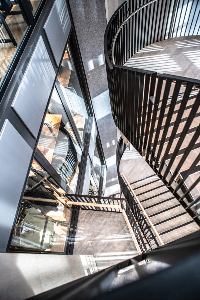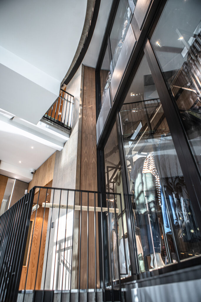 A standout feature of this phase is the quayside staircase, designed by Lovell Ozanne and constructed by Rihoy & Son. Built within the original footprint, it shifts as it rises to use the cantilevered bay, adding both space and impact. A repurposed lift from the neighbouring M&S store was also installed, now fully compliant across all floors. With 13 High Street complete, the upper floors of the original store were refurbished to temporarily house womenswear and lingerie, enabling continued progress.