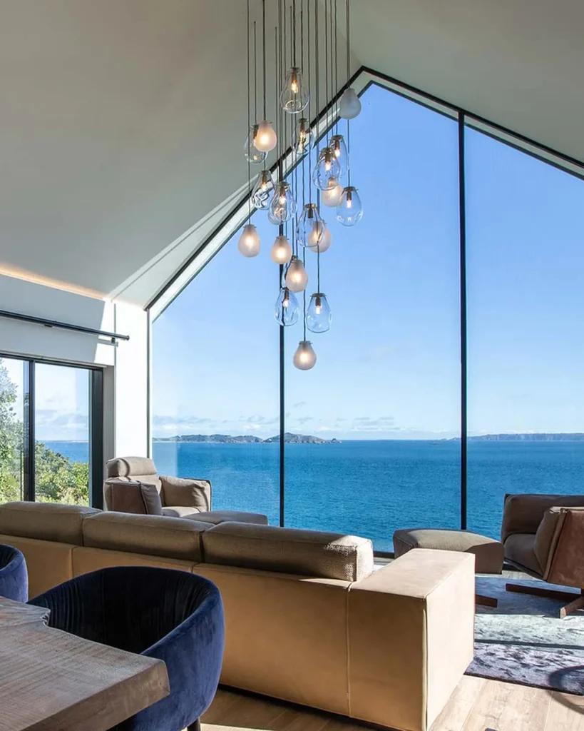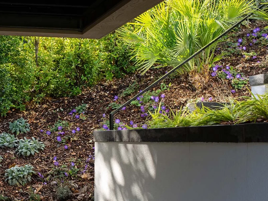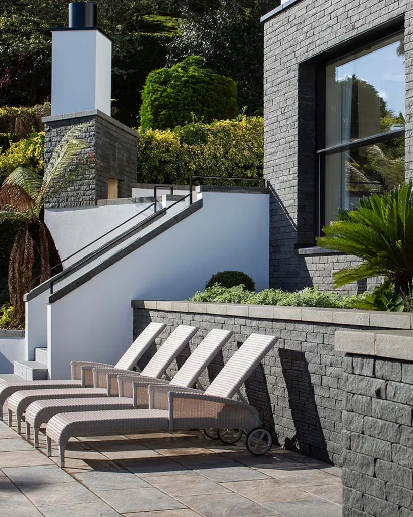 The property is built on a sloping site, with the entrance on the upper floor and the floor below opening up to breathtaking views. The garage was extended to the side of the building and large walls were constructed to create a tiered landscaped garden.