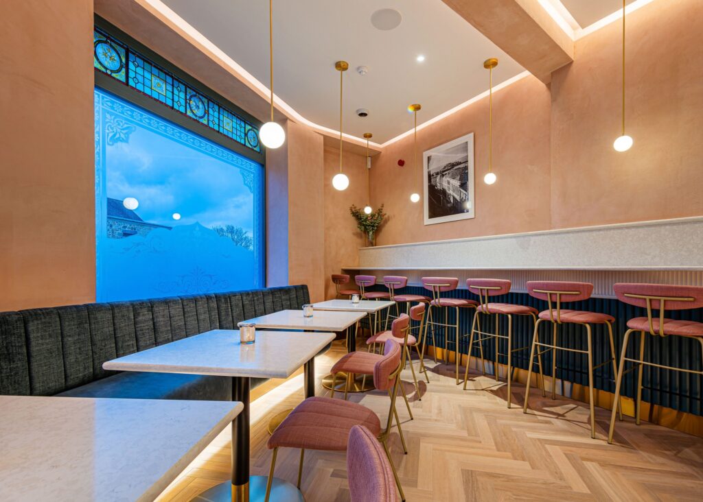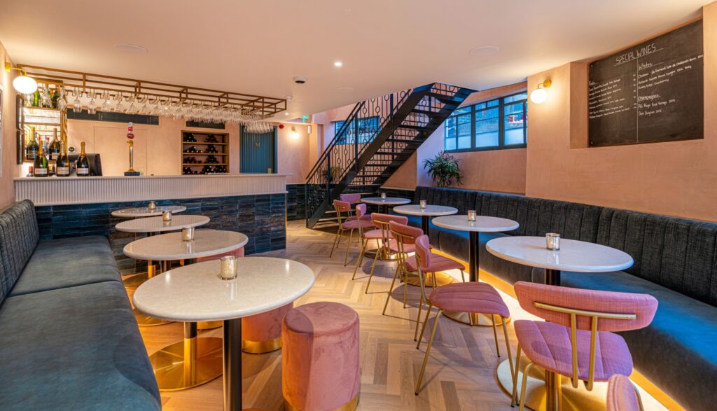The project involved full refurbishment of the ground and first floors, reconfiguring the layout to create a bright, flexible space operating as a café, tapas bar and evening venue. A new steel staircase and double height void improved natural light and vertical flow, connecting the two floors.