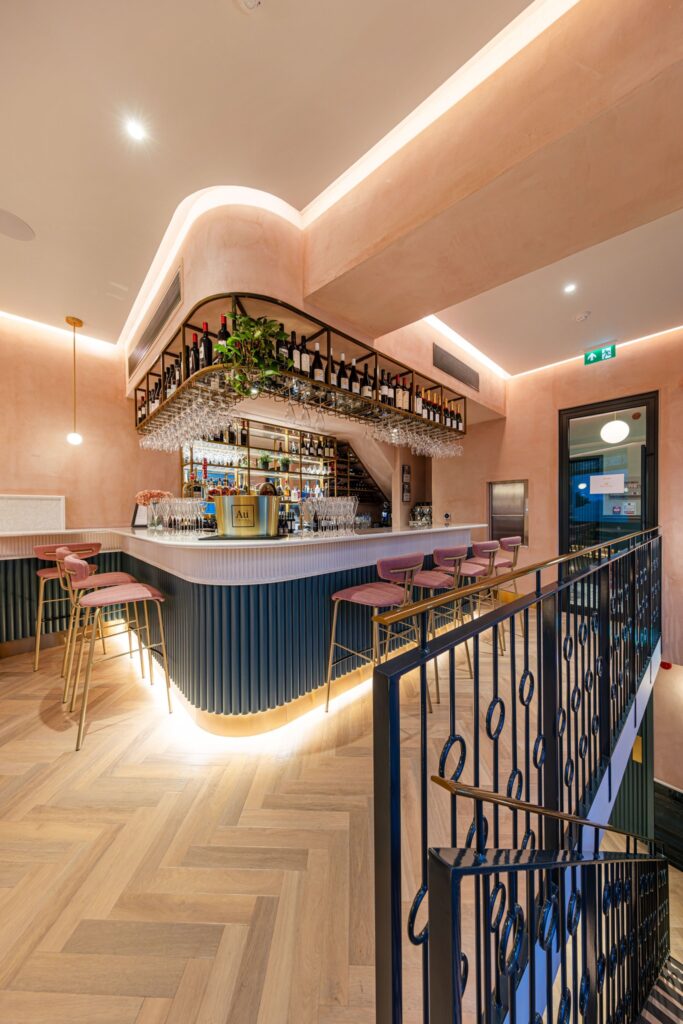 Key features include bespoke fluted timber bars, curved seating, decorated steel shelving and handcrafted terrazzo tiling. Finishes such as clay plaster, brass fittings and herringbone flooring bring warmth and character.
